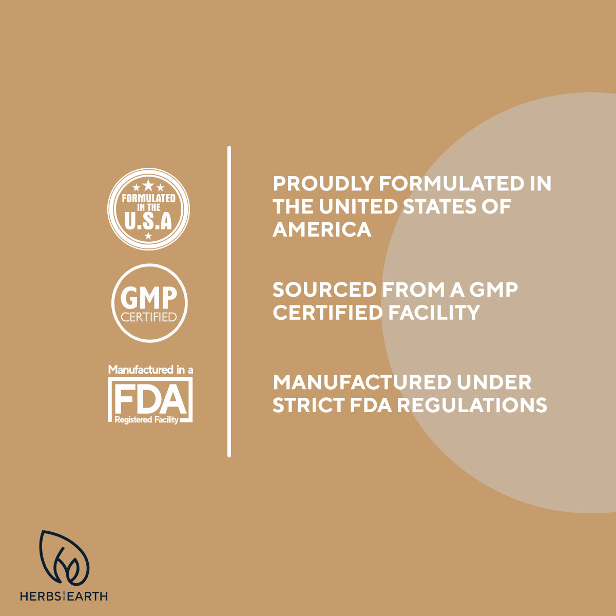 OUR PROMISE TO YOU: Herbs of the Earth products are manufactured in the USA in an FDA-approved lab meeting GMP standards.