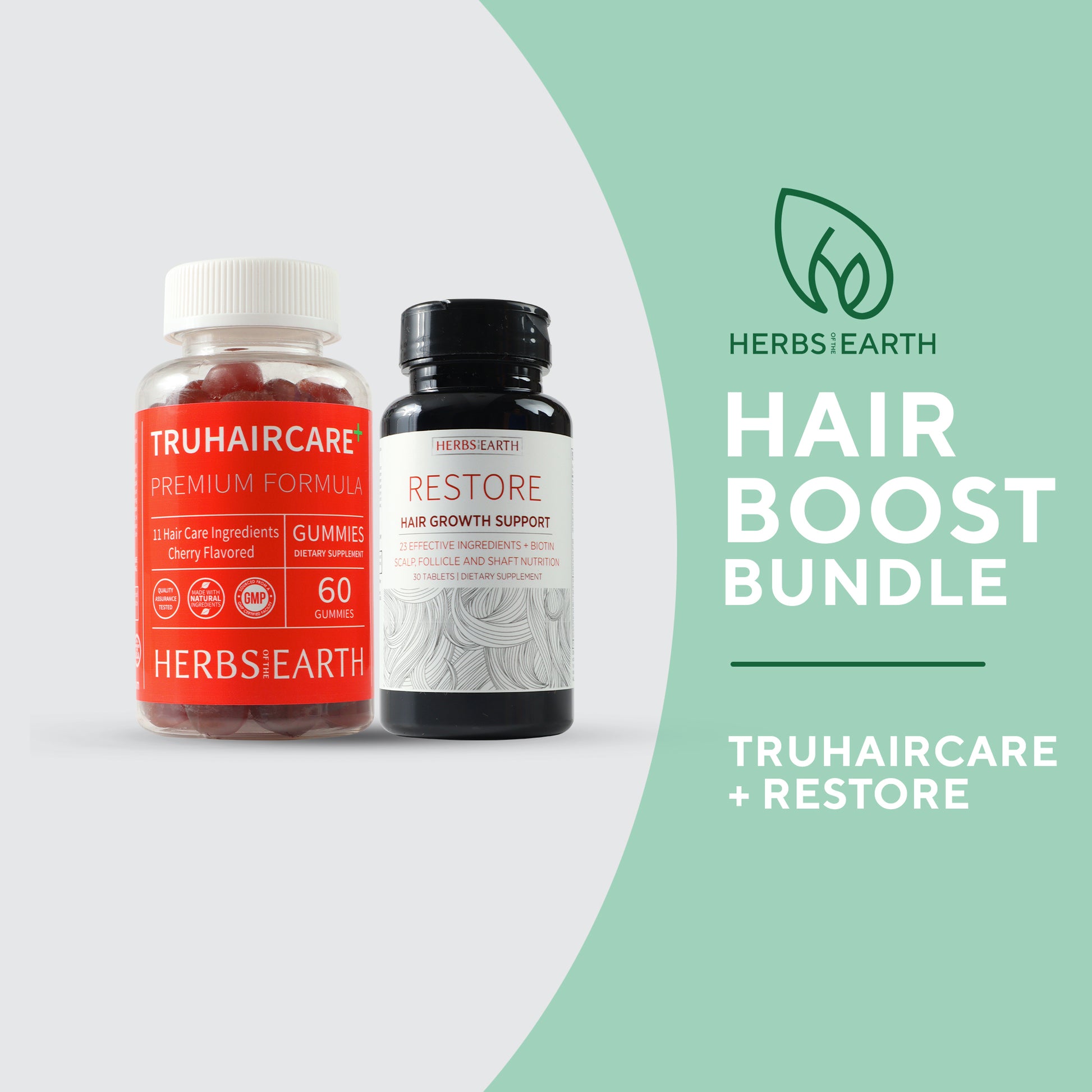 Hair Boost: TRUHAIRCARE 60 Cherry Flavored Gummies + RESTORE 30 Tablets from Herbs of the Earth
