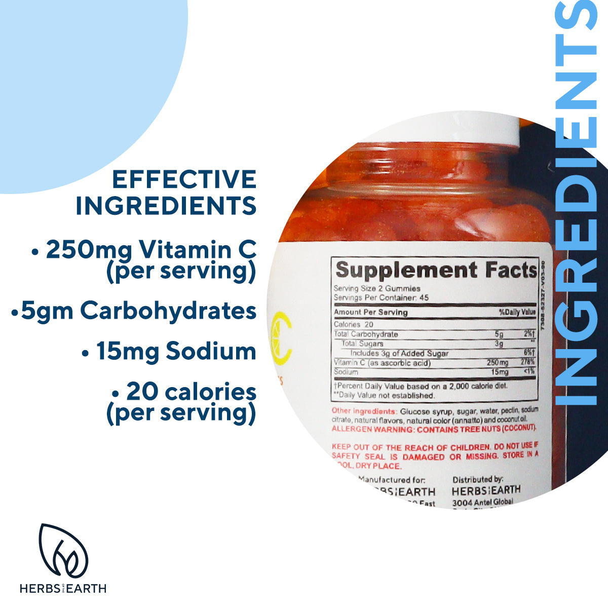 Vitamin C gummies are taken as a supplement for immune support, formation of collagen, absorption of iron, wound healing, and the maintenance of cartilage, bones, and teeth.