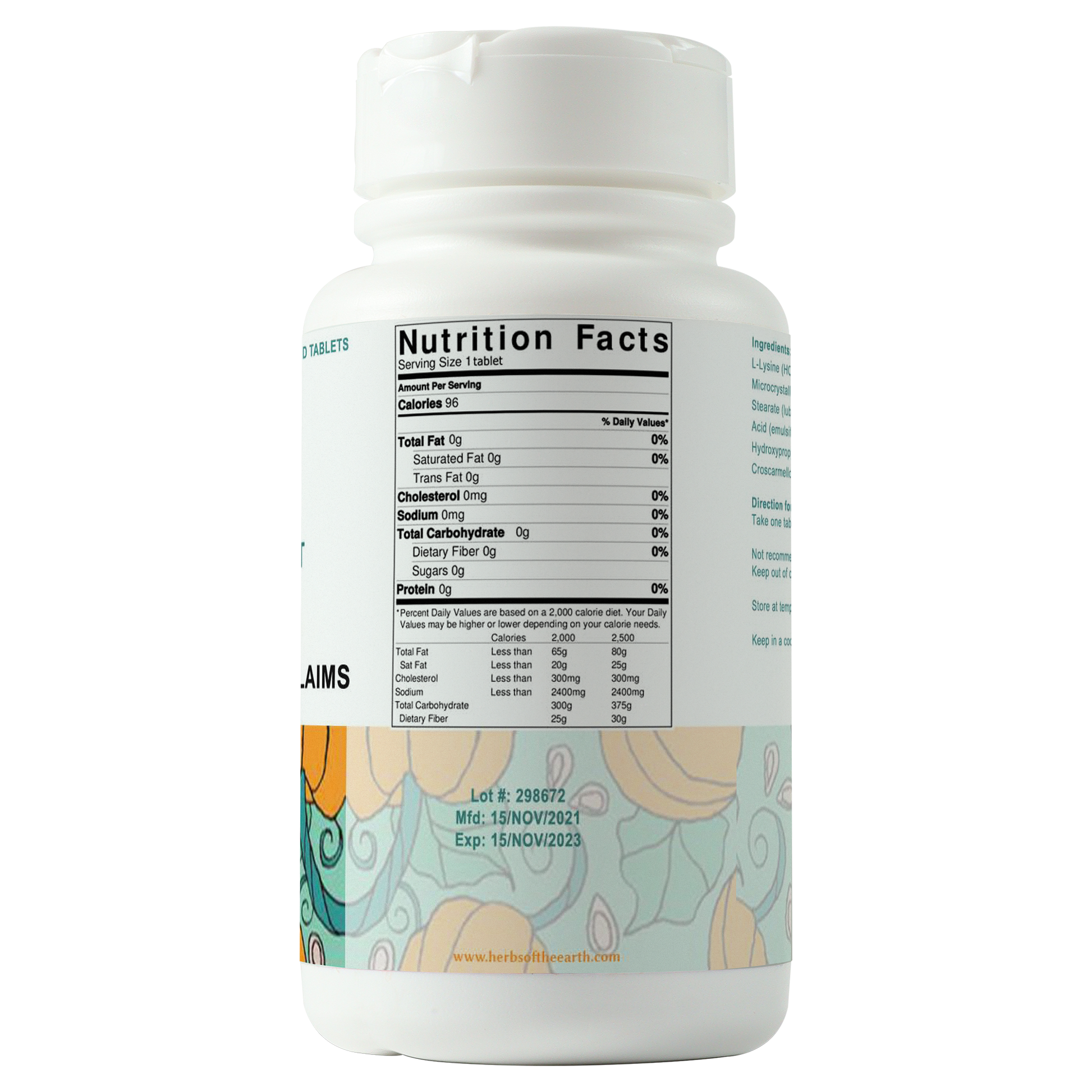 Lysine is an amino acid that your body can't make on its own, you must get it from food, which makes it an essential amino acid. Foods rich in protein such as red meat, poultry, fish, dairy products, nuts and legumes etc. are the best sources of lysine but many people are in need of more of the amino acid. Supplementing is a great way to add L-lysine to your diet. Herbs of the Earth L-Lysine tablets are made with pure lysine hydrocholoride (HCl), which has been shown to be easy for the body to absorb and use to the fullest.
