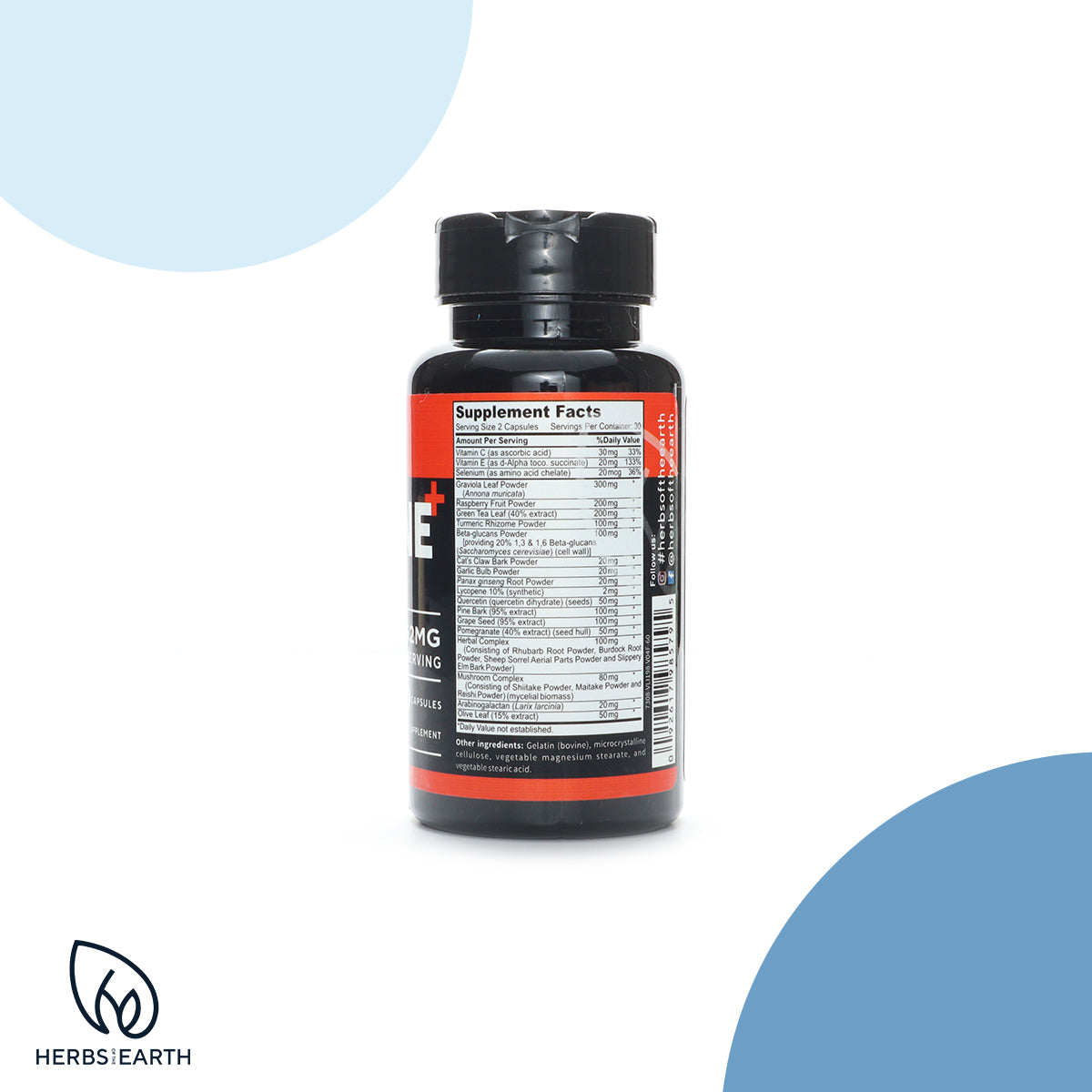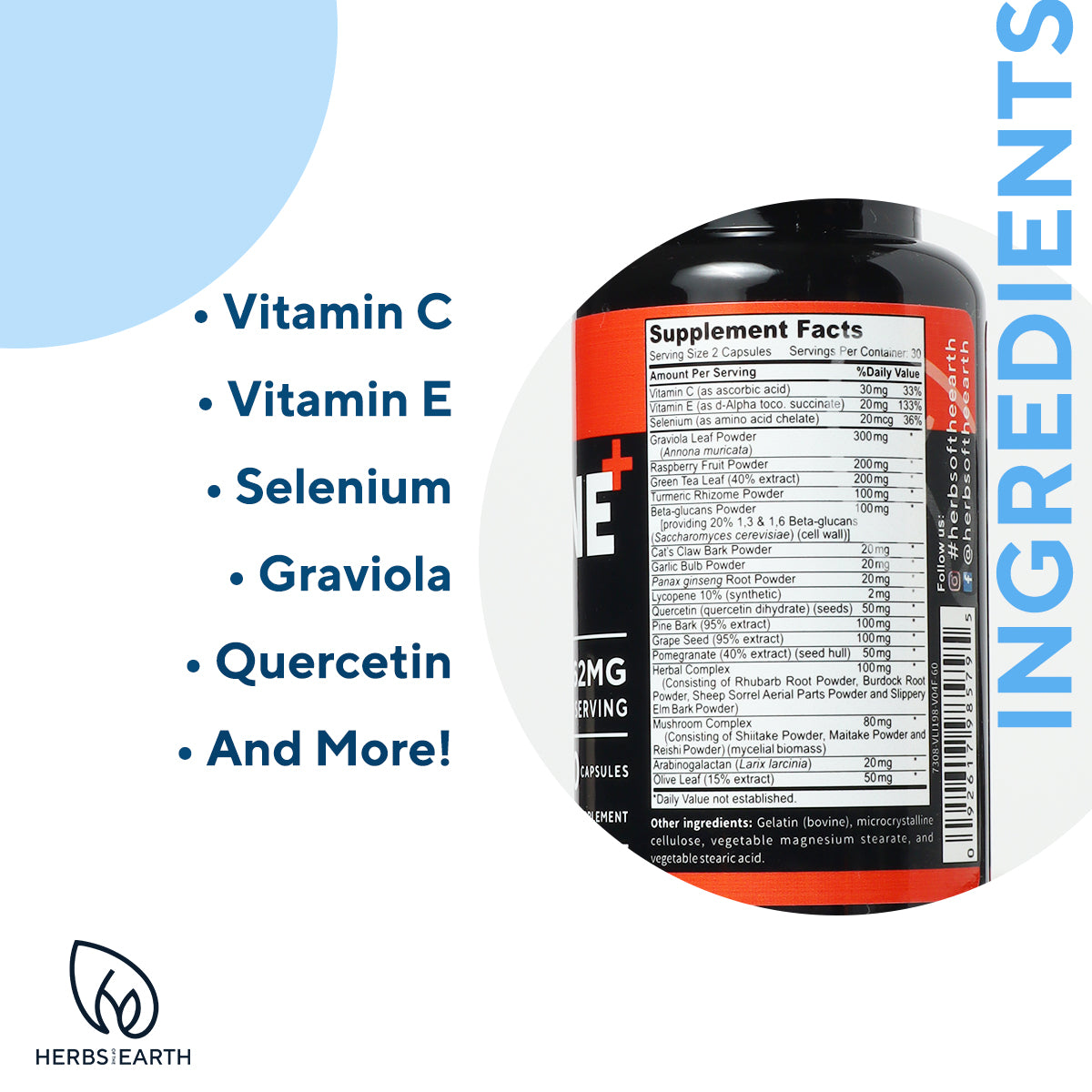 - IMMUNE+ Support Vitamins with 25 Herbs, Superfoods, Mushrooms Vitamins C & E Selenium Turmeric Graviola Beta-Glucans Grape Seed Rhubarb Root Powder, Burdock Root, Sheep Sorel Slippery Elm Herbs of the Earth Immune + 60 Capsules