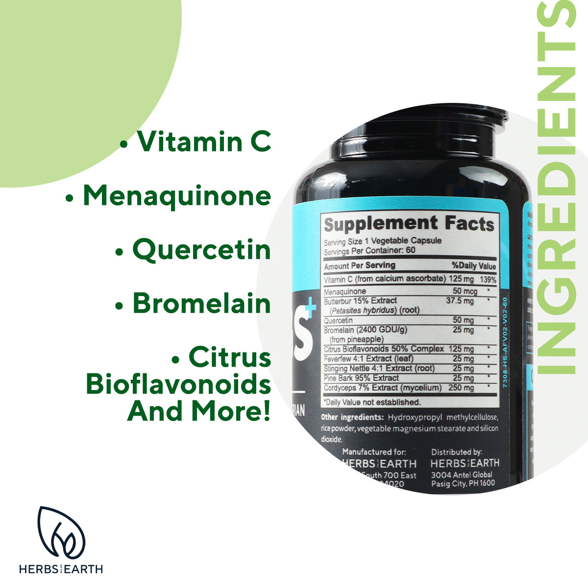- Our NON-GMO supplement provides the respiratory support you've been looking for. Made in the USA in a Good Manufacturing Practice Certified facility, we combine the power of Vitamin C, Menaquinone, Butterbur extract, Quercetin, Bromelain, Citrus Bioflavonoids, Feverfew, Stinging Nettle Extract, Pine Bark, and Cordyceps for optimal breathing.