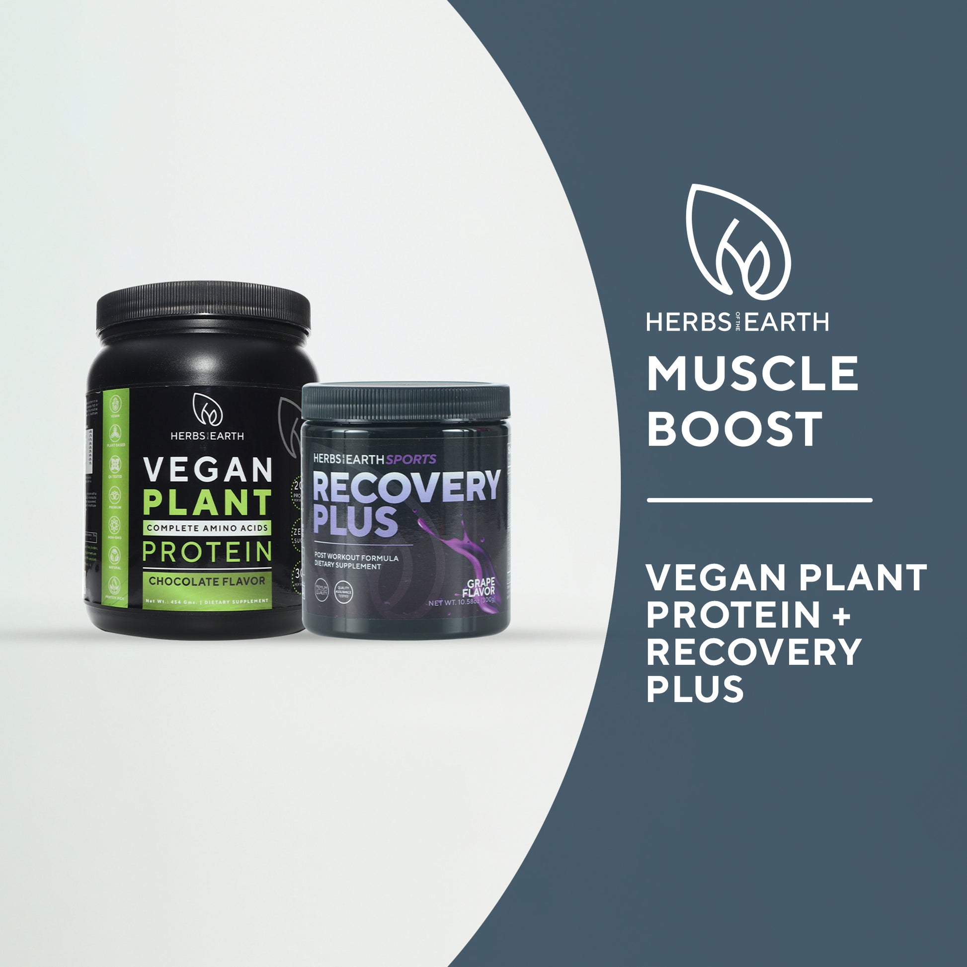 Muscle Boost: Vegan Plant Protein 454g Chocolate Powder + Recovery Plus 300g Grape Powder from Herbs of the Earth