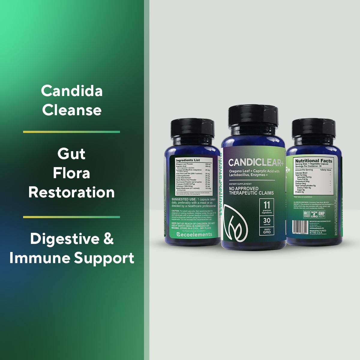 CandiClear combines oregano, caprylic acid, enzymes, aloe, black walnut, wormwood, and reishi with LactoSpore® to cleanse Candida overgrowth while promoting healthy gut flora in a clean, vegan capsule.