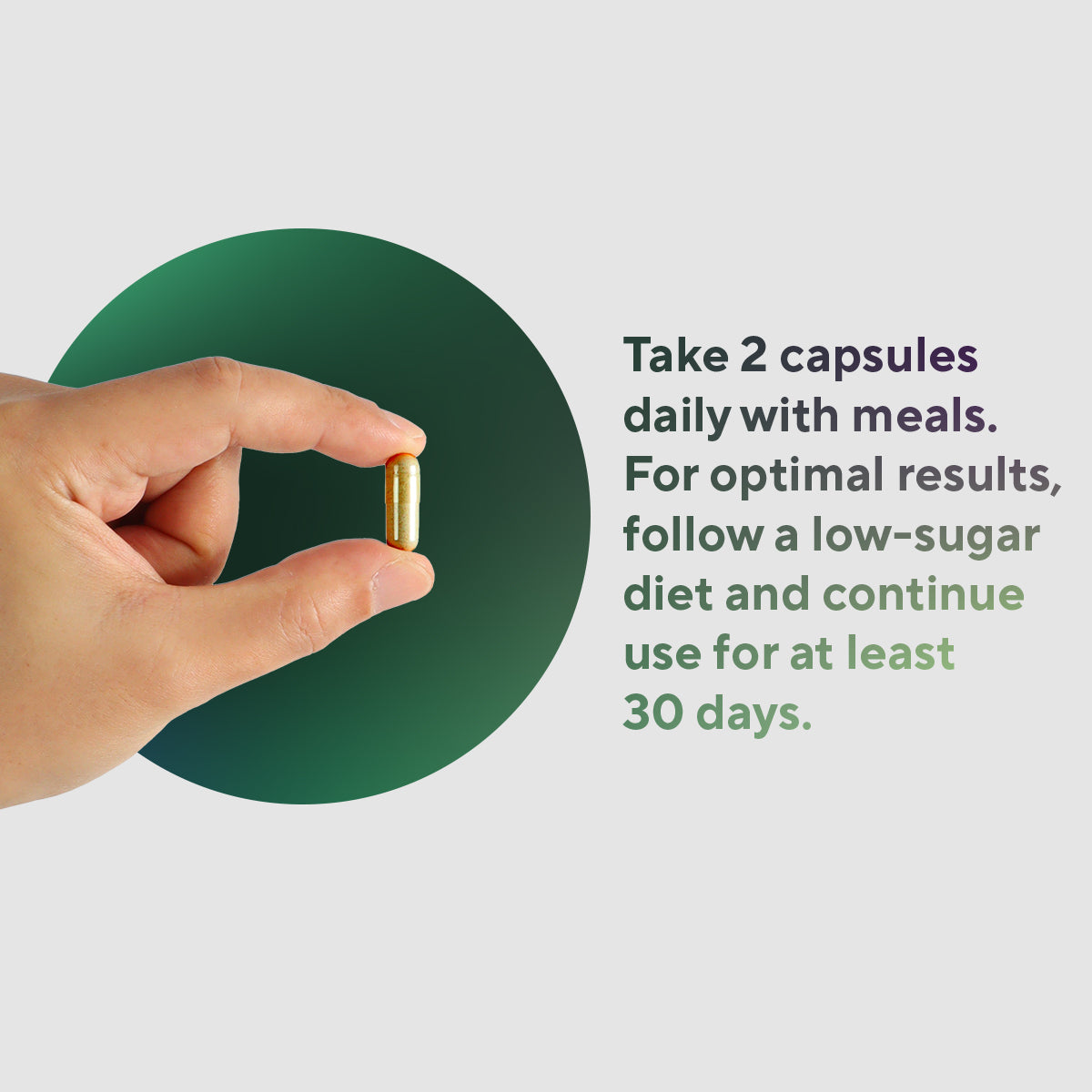 Take 2 capsules daily with meals. For optimal results, follow a low-sugar diet and continue use for at least 30 days.