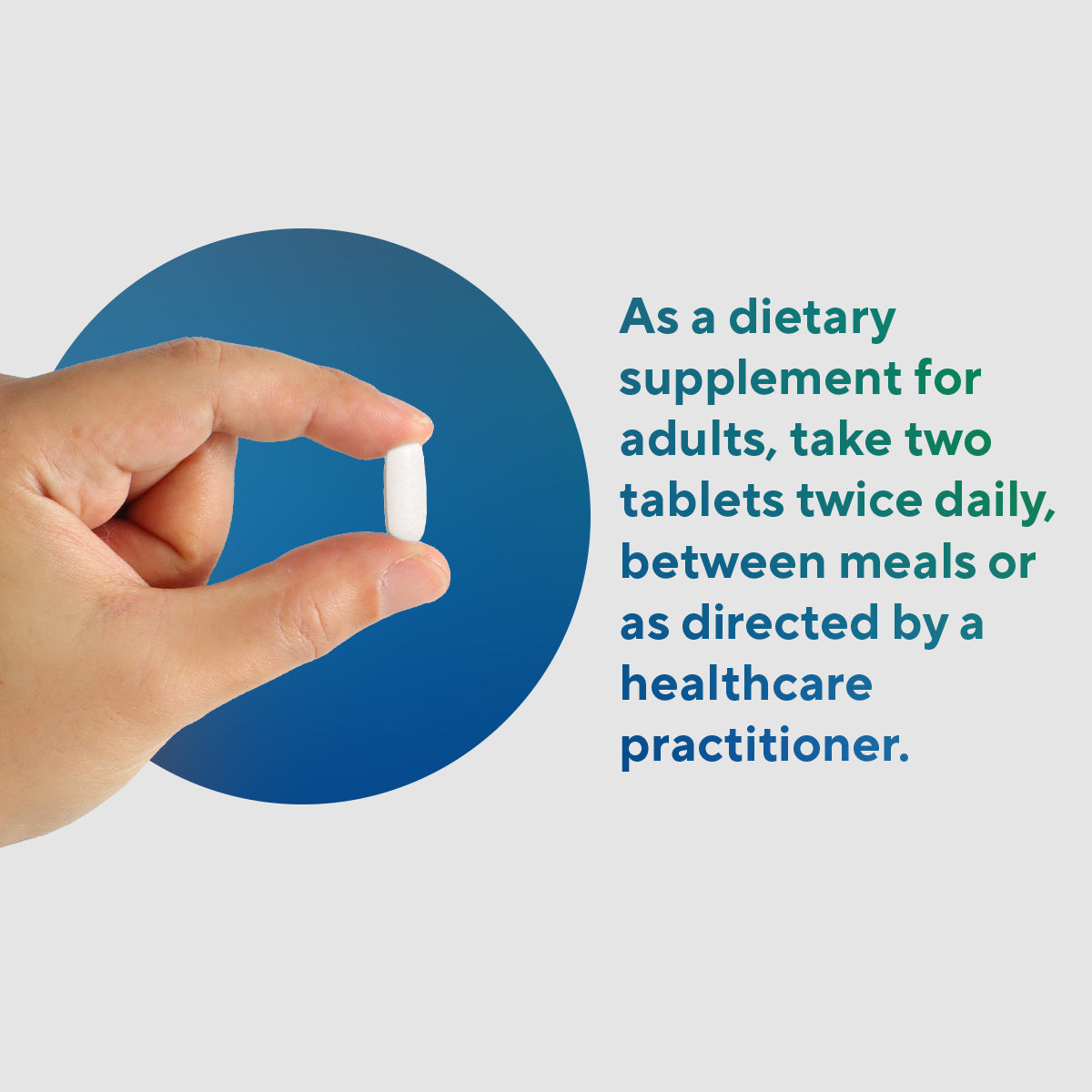 As a dietary supplement for adults, take two (2) tablets twice daily, between meals or as directed by a healthcare practitioner.
