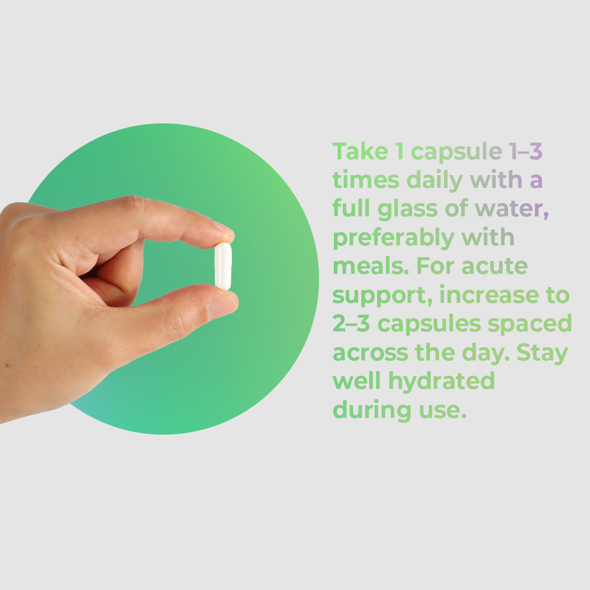 Take 1 capsule 1–3 times daily with a full glass of water, preferably with meals. For acute support, increase to 2–3 capsules spaced across the day. Stay well hydrated during use.