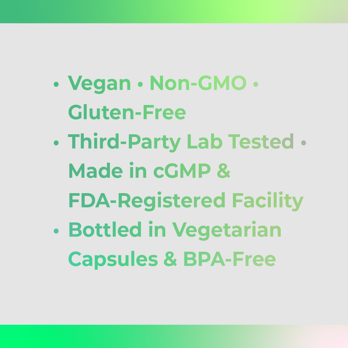• Quality Point: Vegan, Non‑GMO, Gluten‑Free, Made in USA, Third‑Party Tested