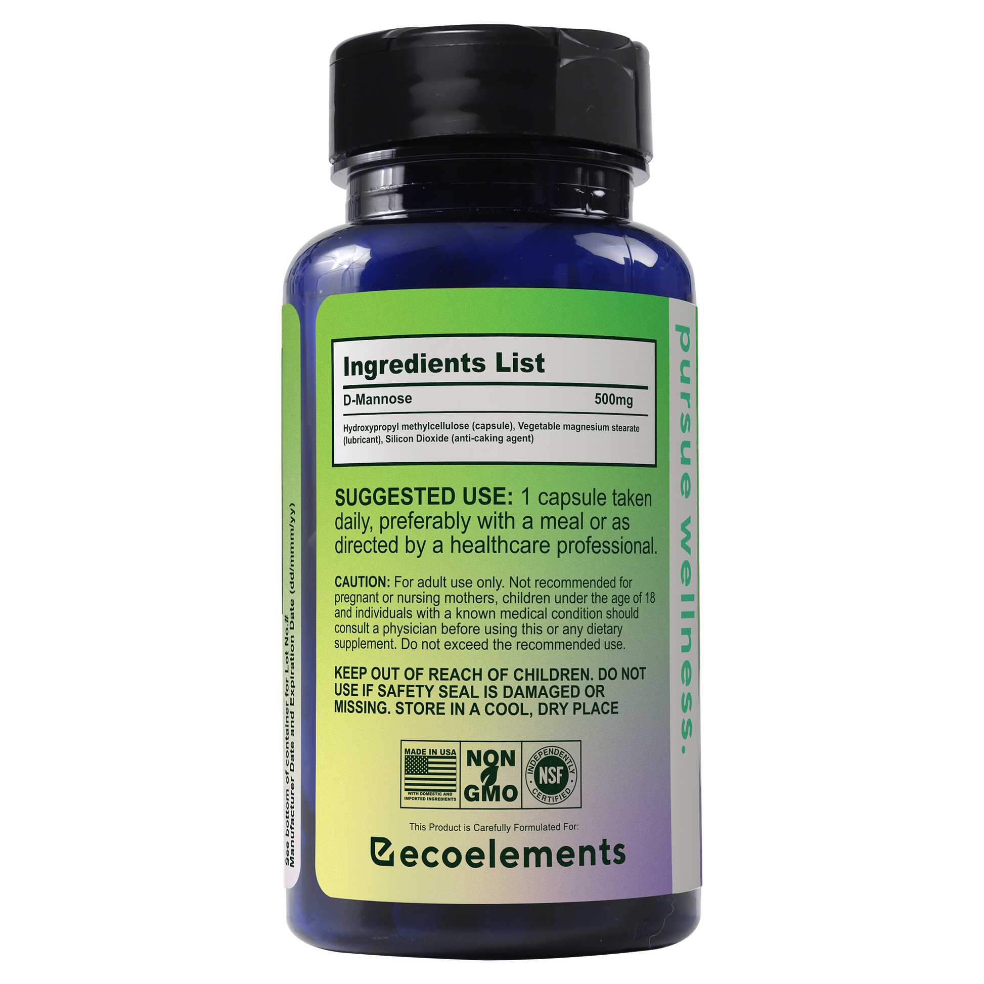 • Formulation: Pure 500 mg D‑Mannose in vegan capsule