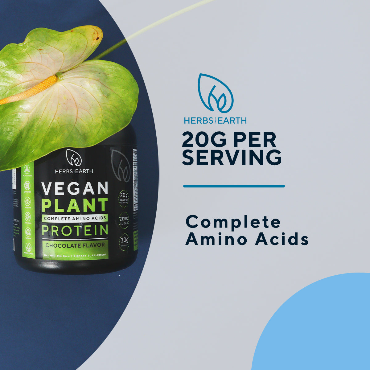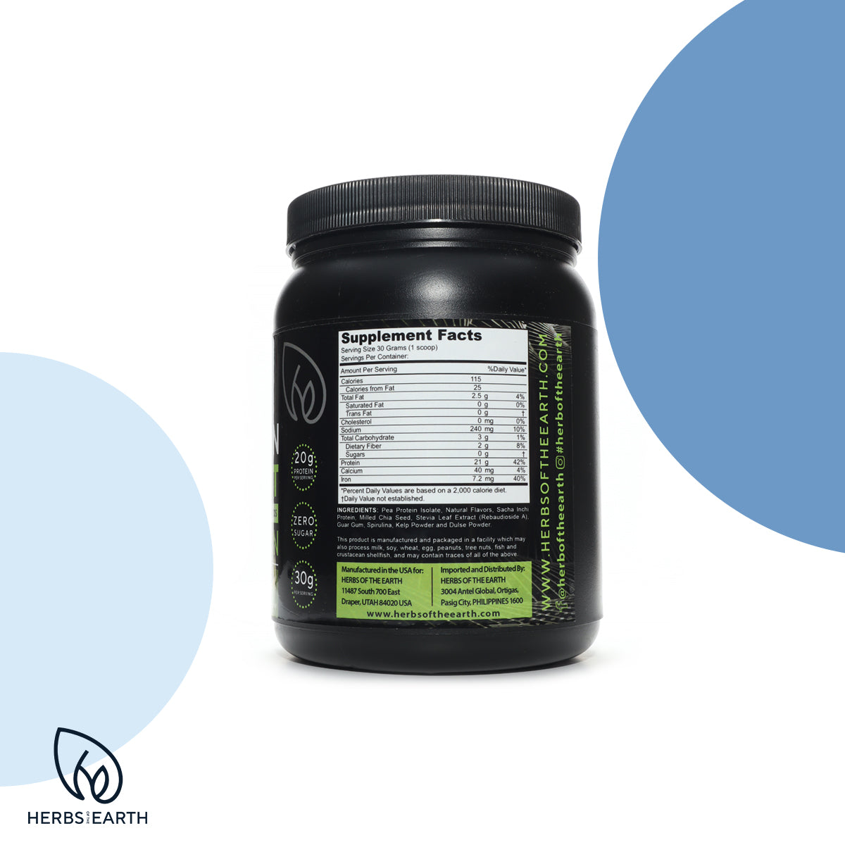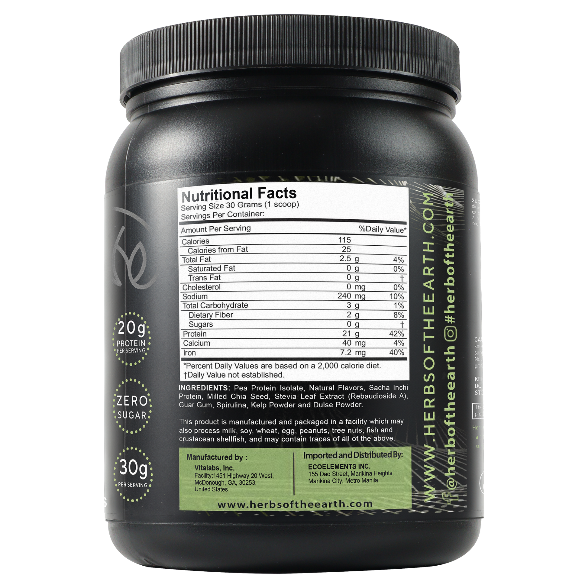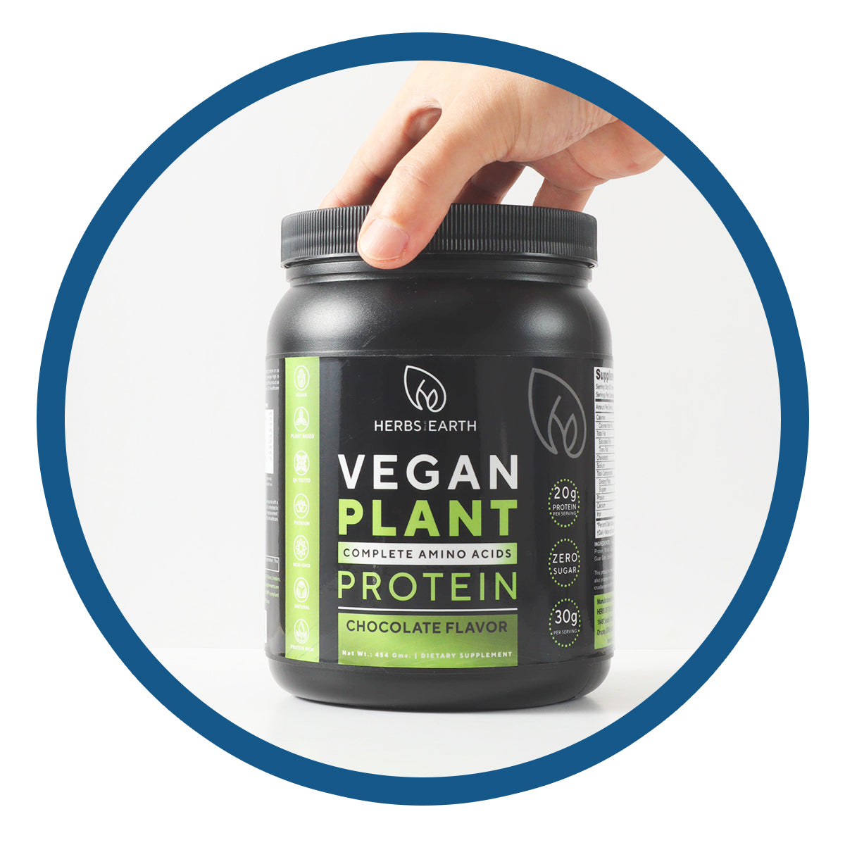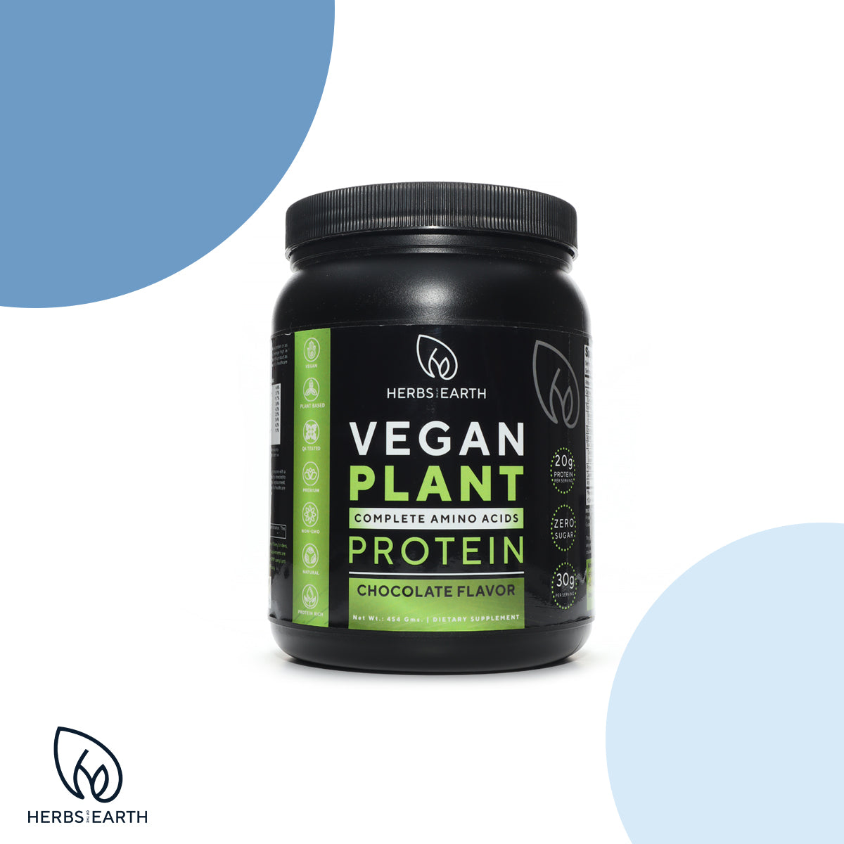 Organic Plant Based Vegan Protein Powder, ZERO Sugar, Non GMO, 20g Protein, Milled Chia seeds, cocoa powder, Multisource protein, vitamins, minerals, probiotics, antioxidants, and omega 3s, 30g per serving, 15 servings, Chocolate Flavor, 454 gram jar, Herbs of the Earth