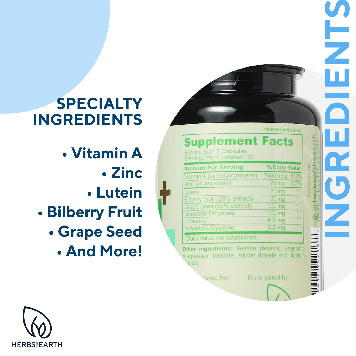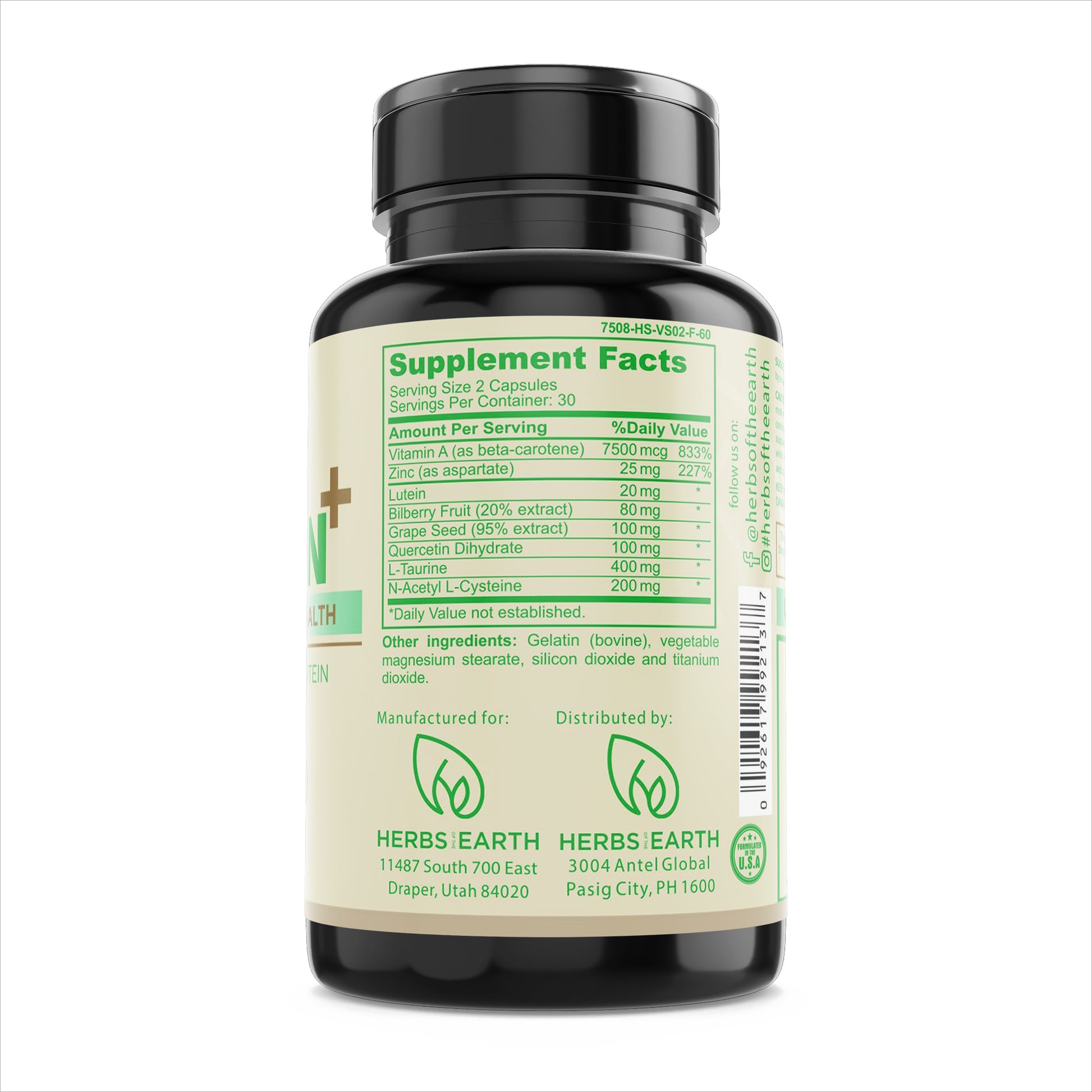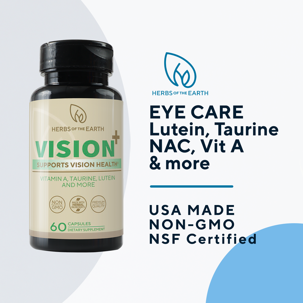 Vision Support - Eye Vitamins, Tired Eyes, NON-GMO Lutein, L-taurine, Vitamin A, N-Acetyl L-Cysteine, Bilberry Fruit, Beta-Carotene, Zinc, Grape seed & vitamins minerals for Blurry Vision, Computer Screen Fatigue 60 Capsules from Herbs of the Earth