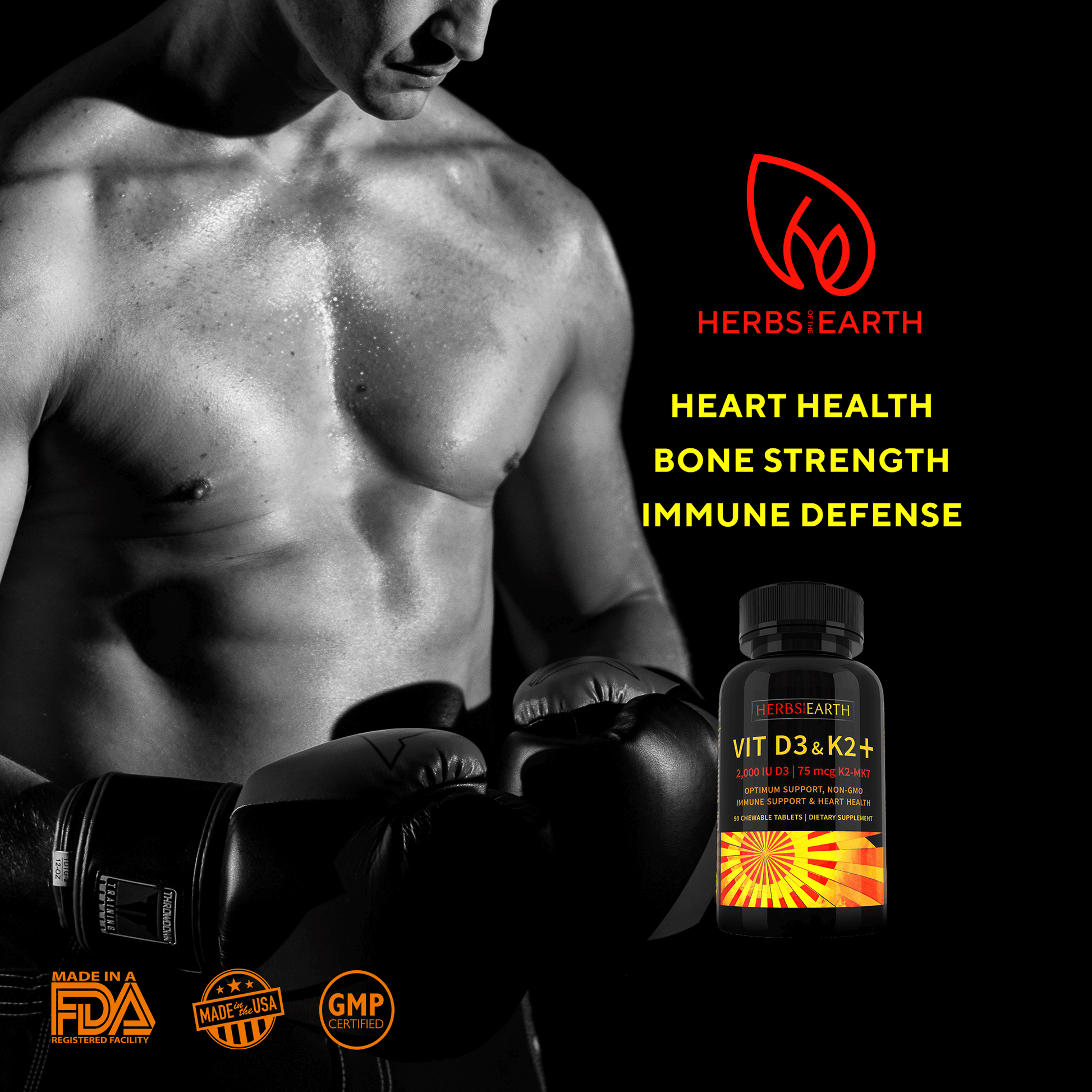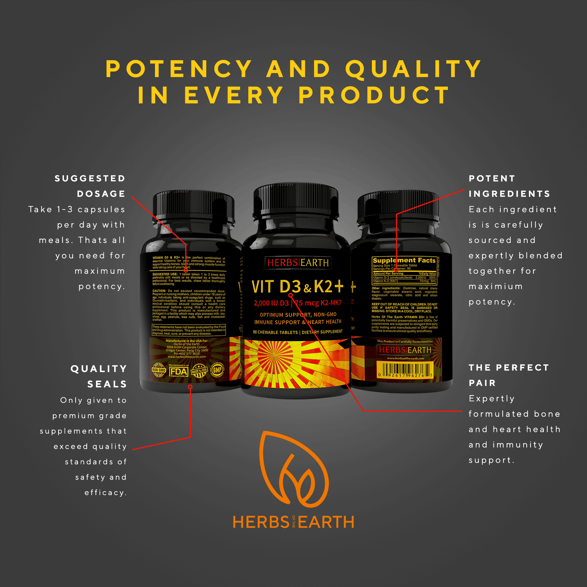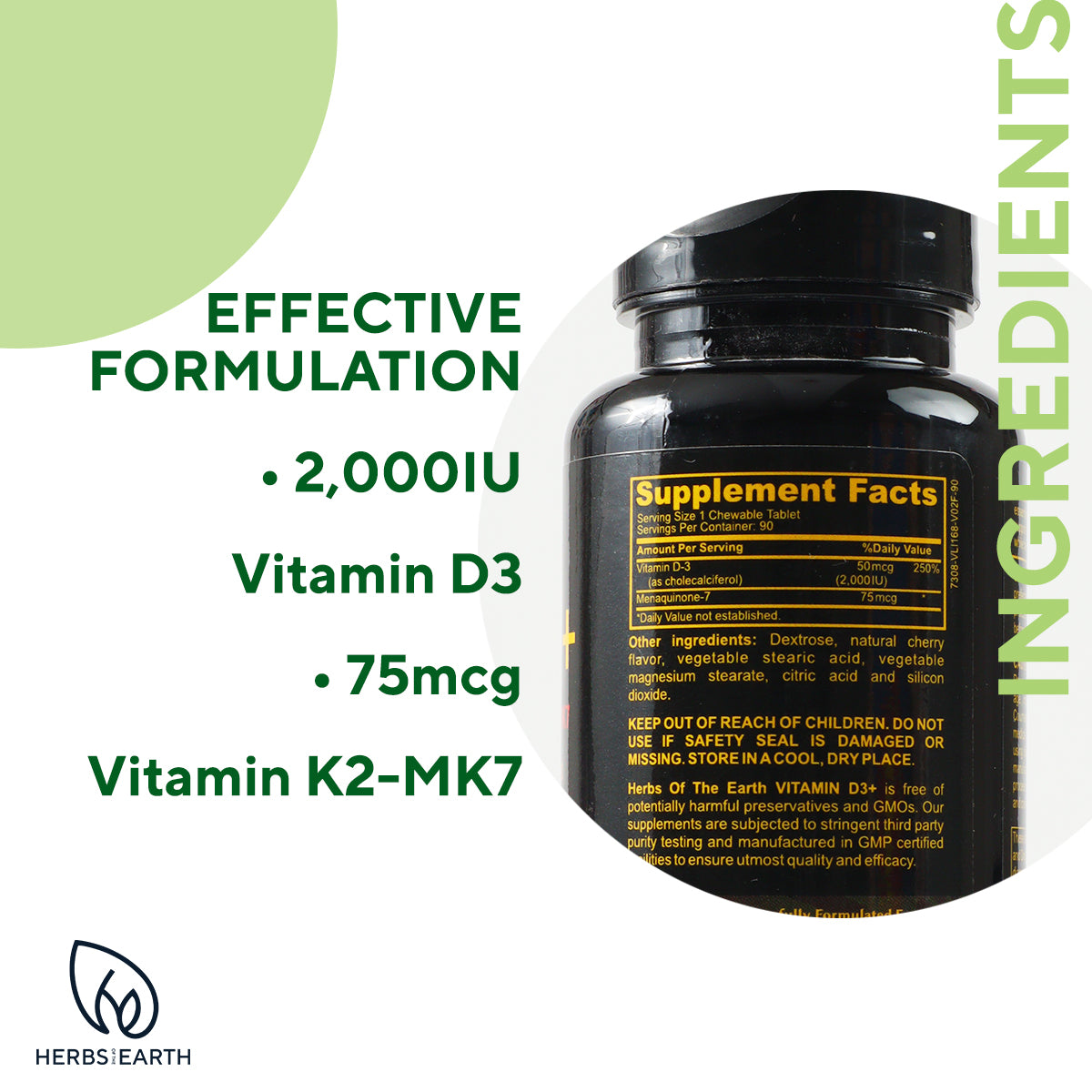 At Herbs of the Earth we take pride in formulating the ultimate health product. Vitamin K2 with D3 is no exception. With 75mcg of Vitamin K2 in the Menaquinone 7 (MK-7) form and 2,000 IU of VItamin D3 this is the perfect bone health, heart health and immune health Vitamin.