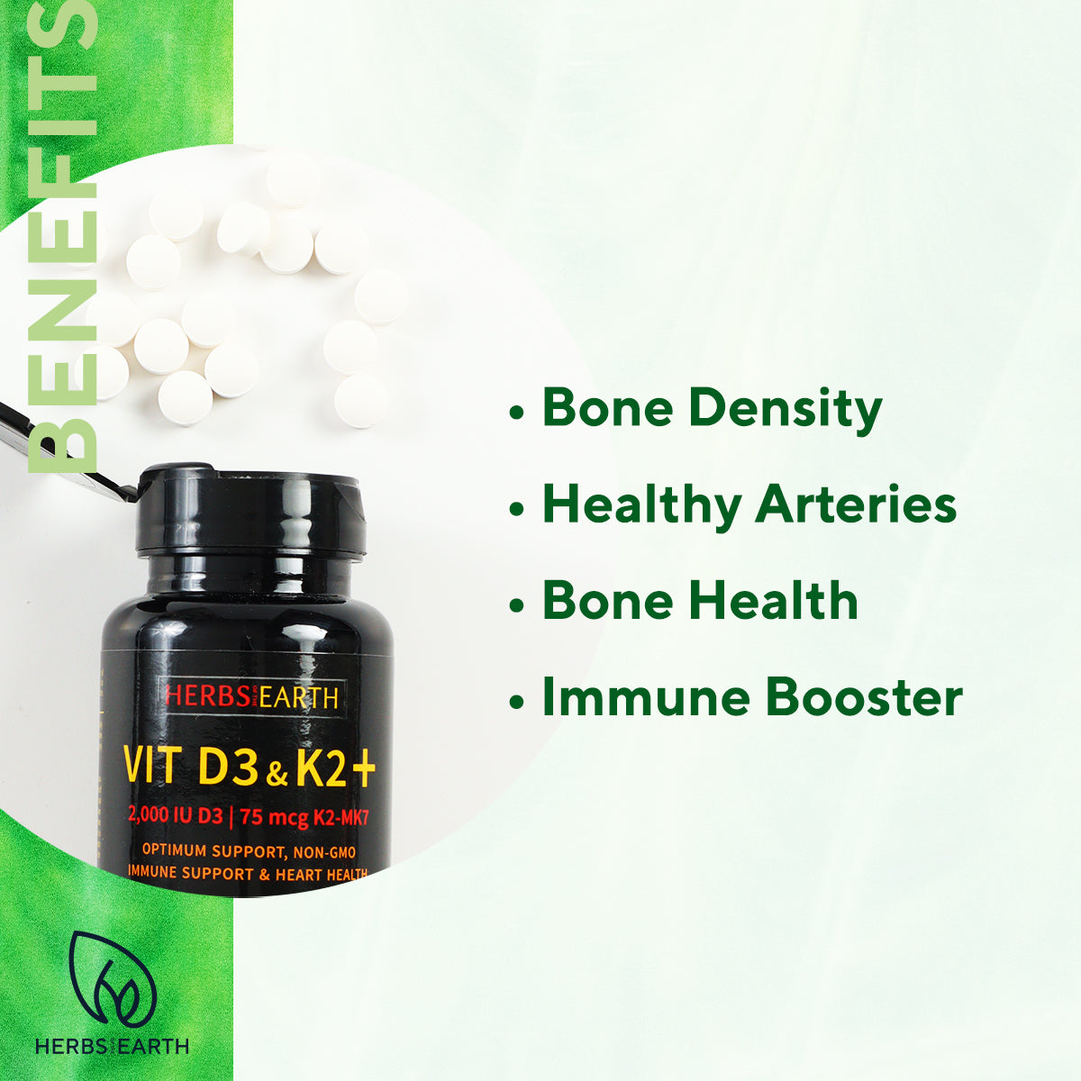 - 2-in-1: 2000 IU of Vitamin D3 & 75 mcg of Vitamin K2 MK-7 for Strong Bones and a Healthy Cardiovascular System.